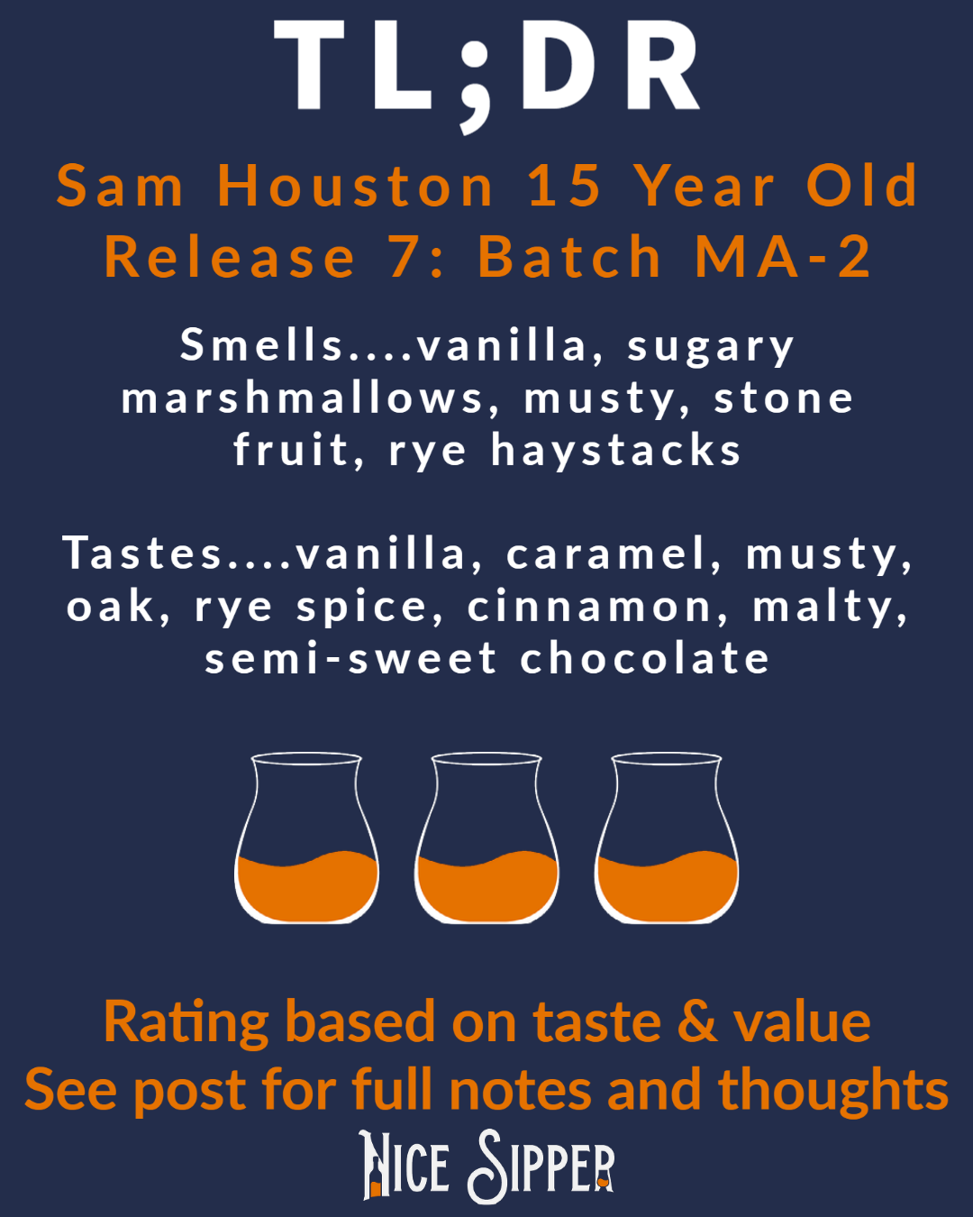 For our second of our two-part comparison of aged bourbons, we are tasting the Sam Houston 15 Year Old, which, to be specific, is Batch MA-2. In the last review, we tasted the Remus Repeal Reserve V (I just noticed the alliteration for the first time), which, much like the plot line from a Rom-Com, it wasn’t love at first sight but by the end, I was interested in pursuing a future with the Remus Repeal series. As I mentioned in the last review, the Sam Houston 15 (going forward, the “Sam”) has a similar age profile as the Remus with similar proofs as well (103° for the Sam, 100° for the Remus). Now that we have isolated two variables, that only leaves about 30 others, but sometimes you gotta take what you can get. While the Remus hails from the Hoosier State, the Sam is from the bluegrass country. That said, the Sam Houston is also decently more expensive, running at $125 versus $86 for Remus, so that will certainly be a major factor in our quest for value.